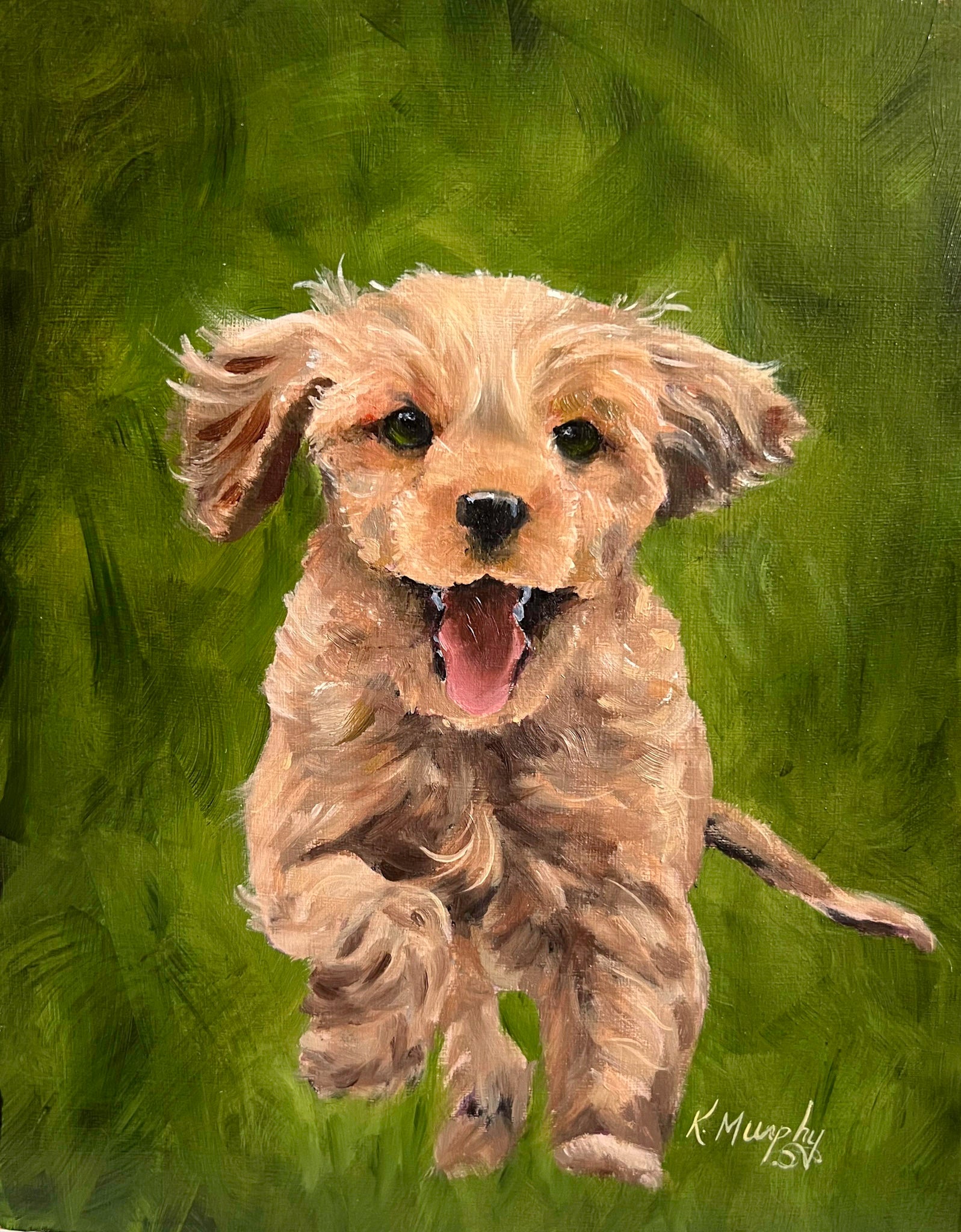 Sweet puppies are the best! Romping through the summer grass. This adorable puppy was painted in professional grade oil paints on a wooden cradle. Measurements are 11x14x1